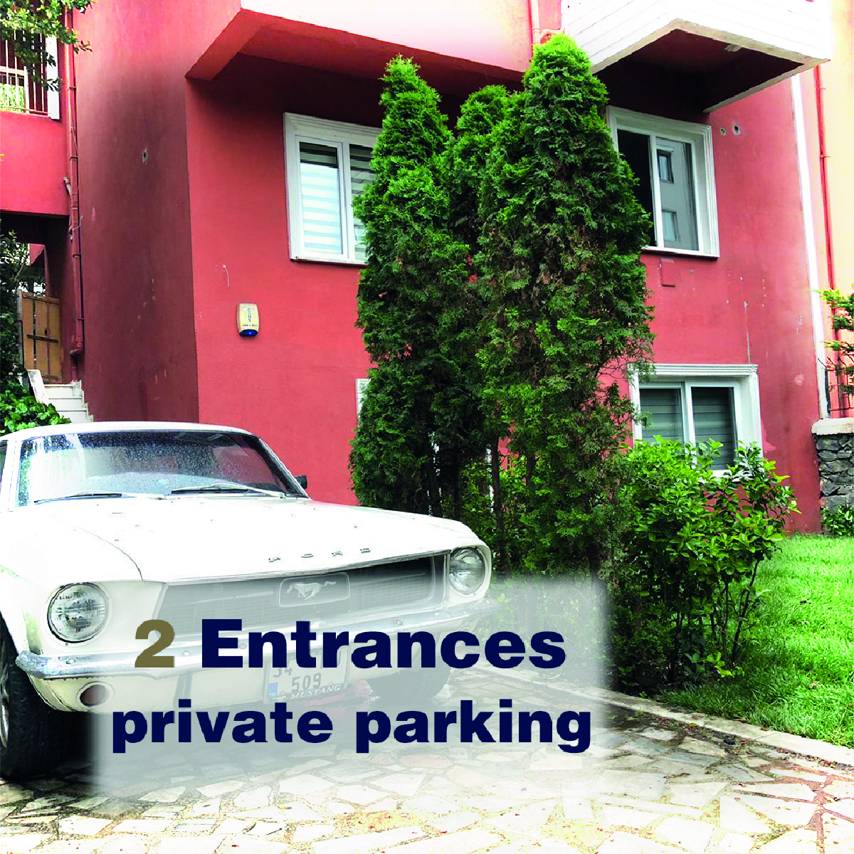 There are 2 entrances of the villa. 3 cars can be parked at the garden parking area.